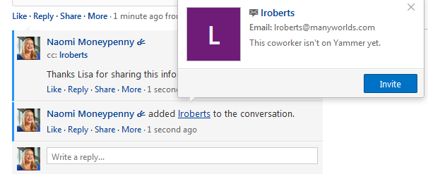 Going beyond that, Yammer now allows you to @mention a person using their email address, so even if your colleague is not on Yammer, they’ll get a notification that they’ve been added to the discussion.